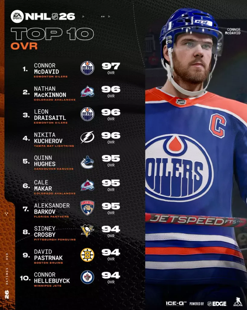 EA Sports NHL 26 releases their top 10 overall players to play in the game.